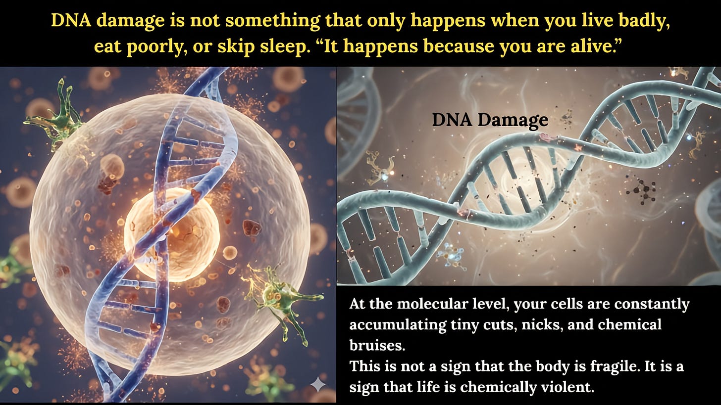 DNA damage is not something that only happens when you live badly, eat poorly, or skip sleep. âIt happens because you are alive.â