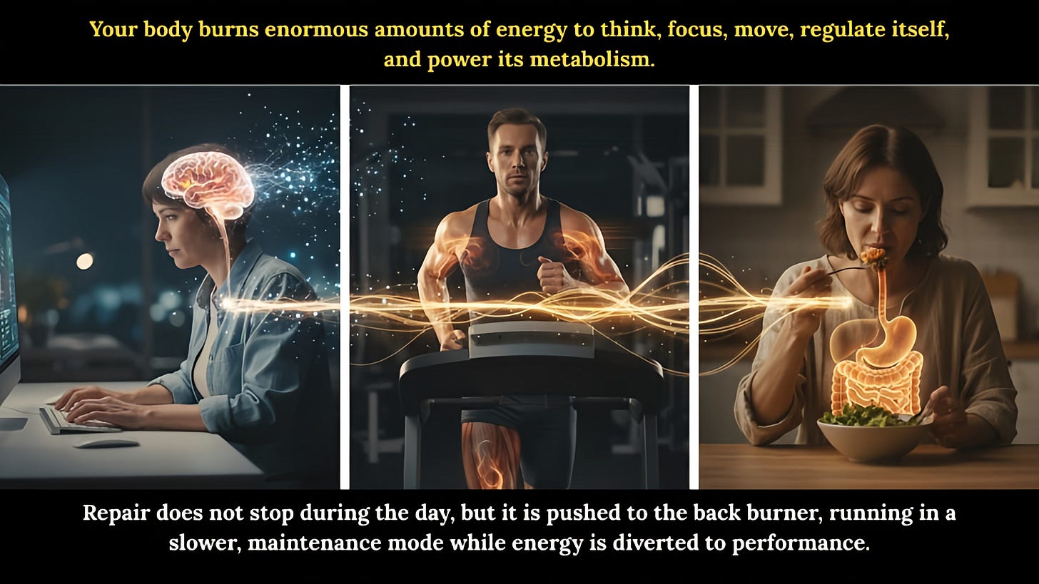 All of the repair systems you just read aboutâDNA repair, protein quality control, autophagy, immune surveillance, organelle maintenance, waste clearanceâare extremely energy-intensive. They require ATP, enzymes, molecular machines, and tightly coordinated cellular logistics. Running them at full capacity while also running the body in âactive modeâ would be like trying to rebuild a city while every highway is packed with traffic.